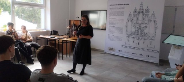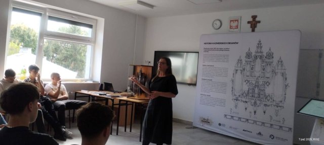 7 października 2025 r. Pani Anna Szymańska, przewodnik PTTK, na zaproszenie Pani Anny Wiśniewskiej, naszej nauczycielki niemieckiego, wygłosiła prelekcję historyczno-edukacyjną w ramach projektu unijnego dotyczącą Kazimierza Dolnego i organów kazimierskich, które należą do najstarszych grających organów w Polsce. Nasi uczniowie mieli okazję, aby sprawdzić swoją wiedzę na temat tego zabytkowego instrumentu podczas interaktywnego quizu oraz jeszcze przez kilka dni podziwiać miniaturę organów.